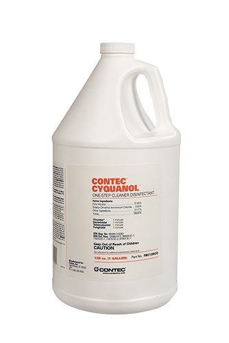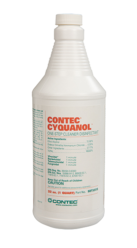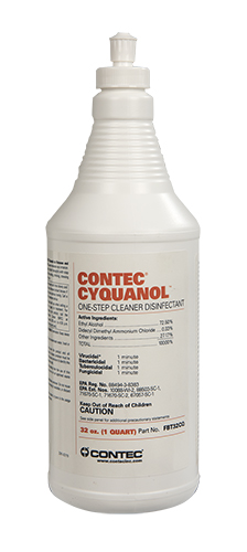 Contec® CyQuanol™ es un desinfectante de amplio espectro registrado por la EPA con un tiempo de eliminación de 1 minuto que permite a las instalaciones cumplir fácilmente con los tiempos de permanencia requeridos en las superficies. CyQuanol™ es una mezcla de amonio cuaternario y alcohol etílico en un envase de 32 oz (0.9 L) y 1 galón (3.8 L). Es un limpiador/desinfectante listo para usar que genera pocos residuos.