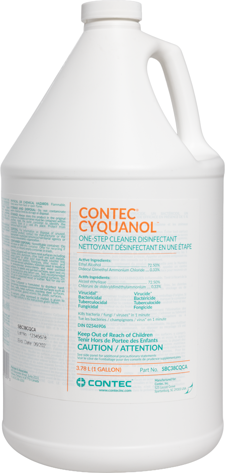 Contec® CyQuanol™ es una mezcla registrada por Health Canada de amonio cuaternario y alcohol etílico en envases de 0,9 l y 3,8 l. Es un limpiador/desinfectante listo para usar que genera pocos residuos.